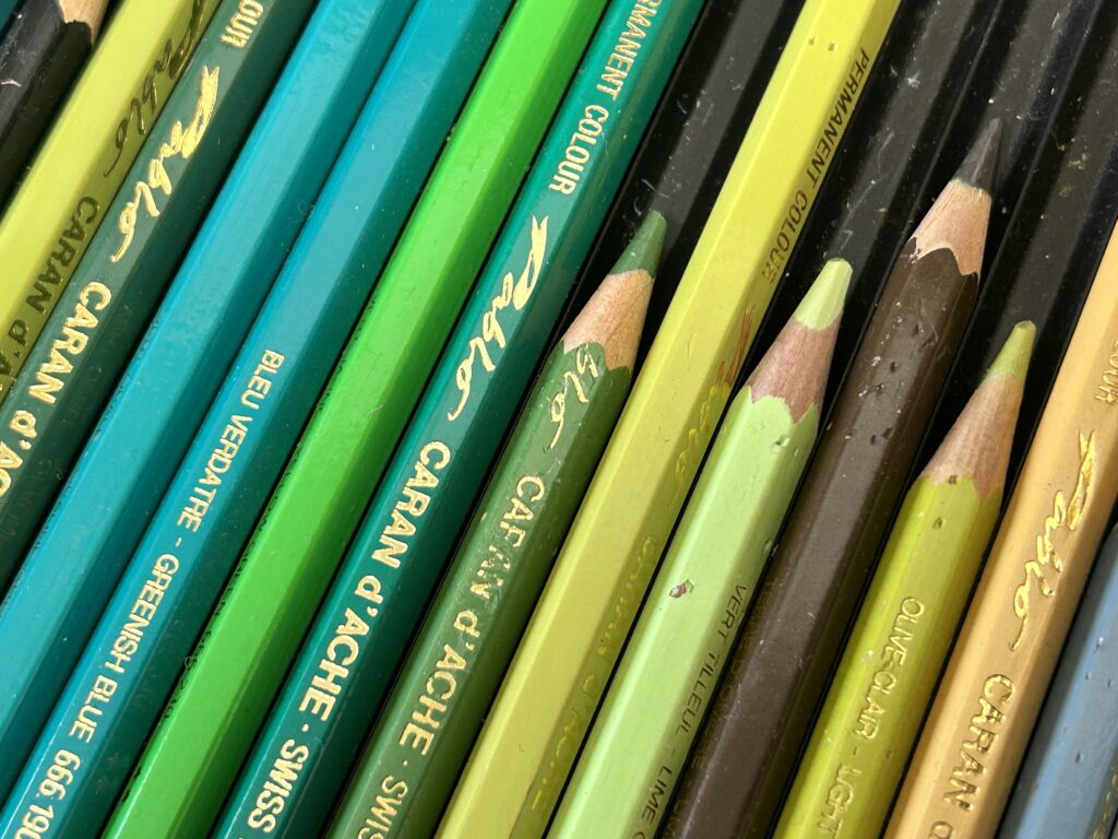 Mijn tekeningen worden gemaakt met kleurvast, “waterproof” potloden van het merk Caran d’Ache.